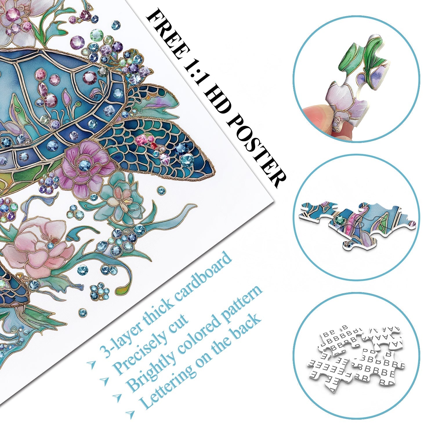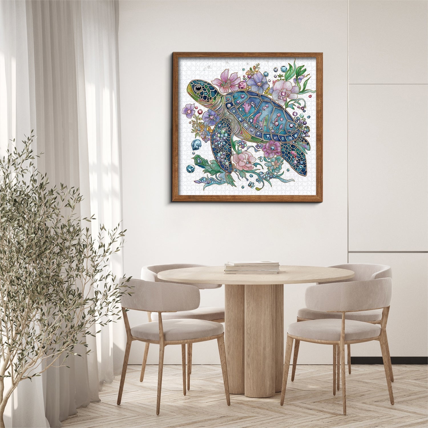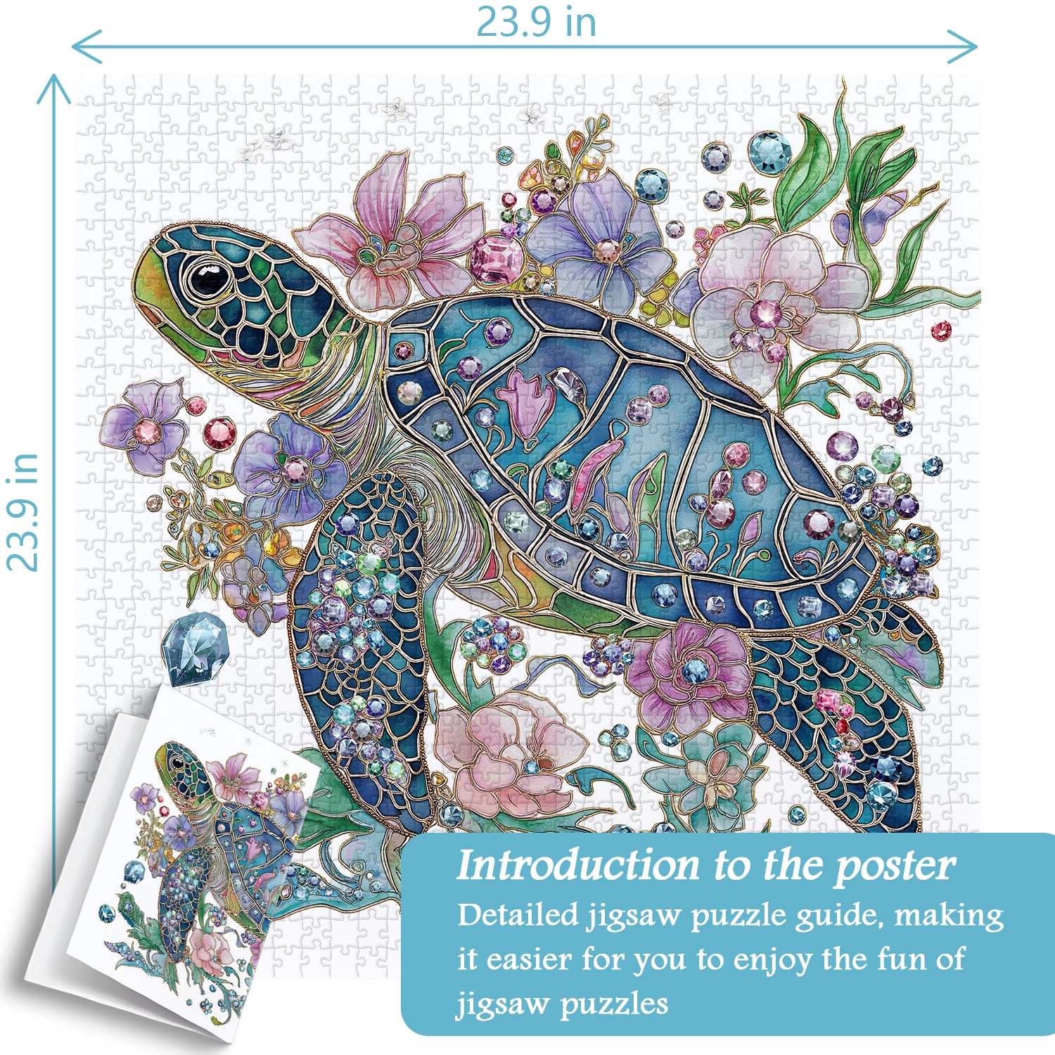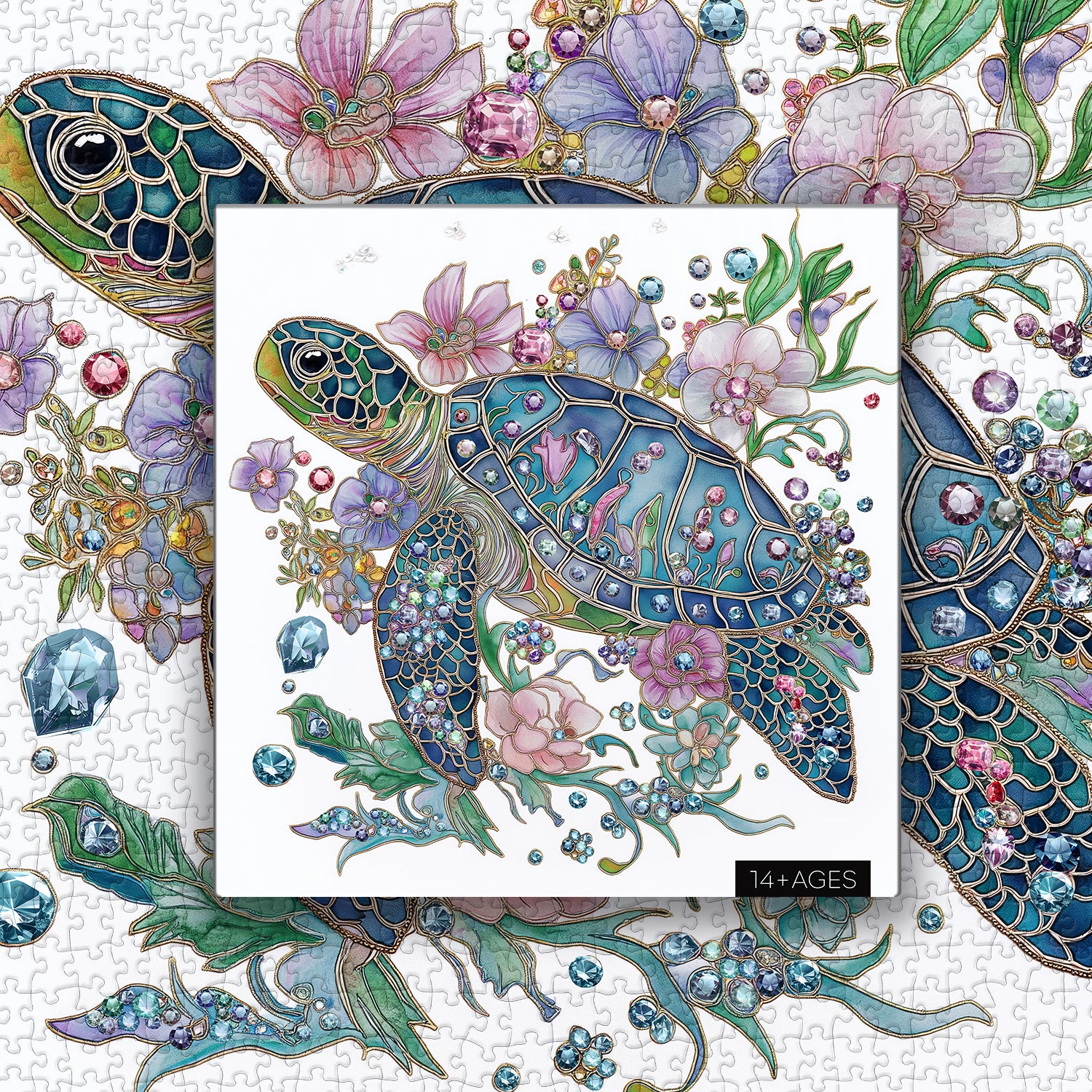 A Mesmerizing Ocean Jewel:Â Dive into a magical underwater world with the Shining Turtle Jigsaw Puzzle. This beautiful design features a sparkling blue-green turtle, its shell adorned with delicate, gemstone-crafted flowers that shimmer like treasures from the deep sea.